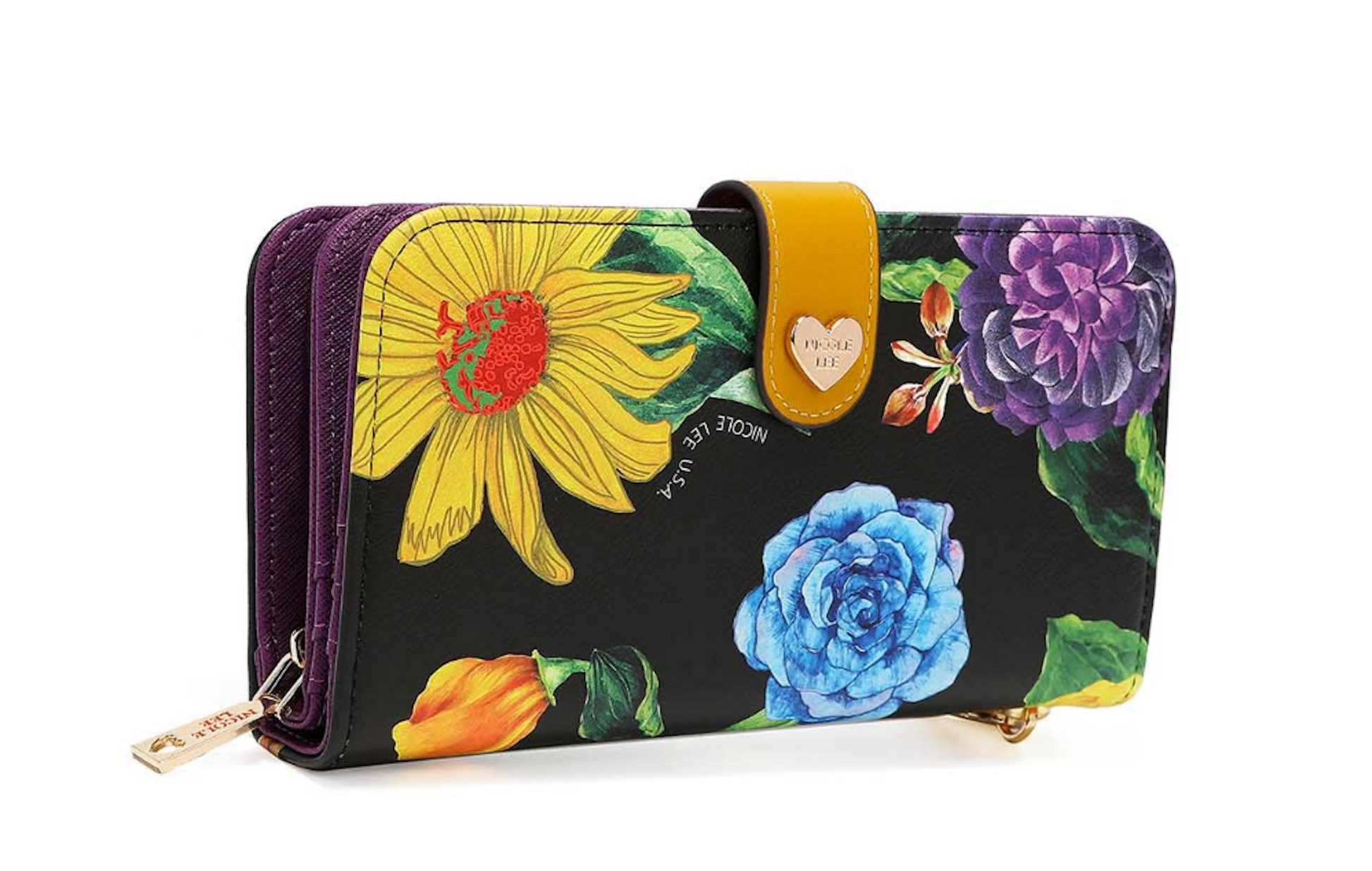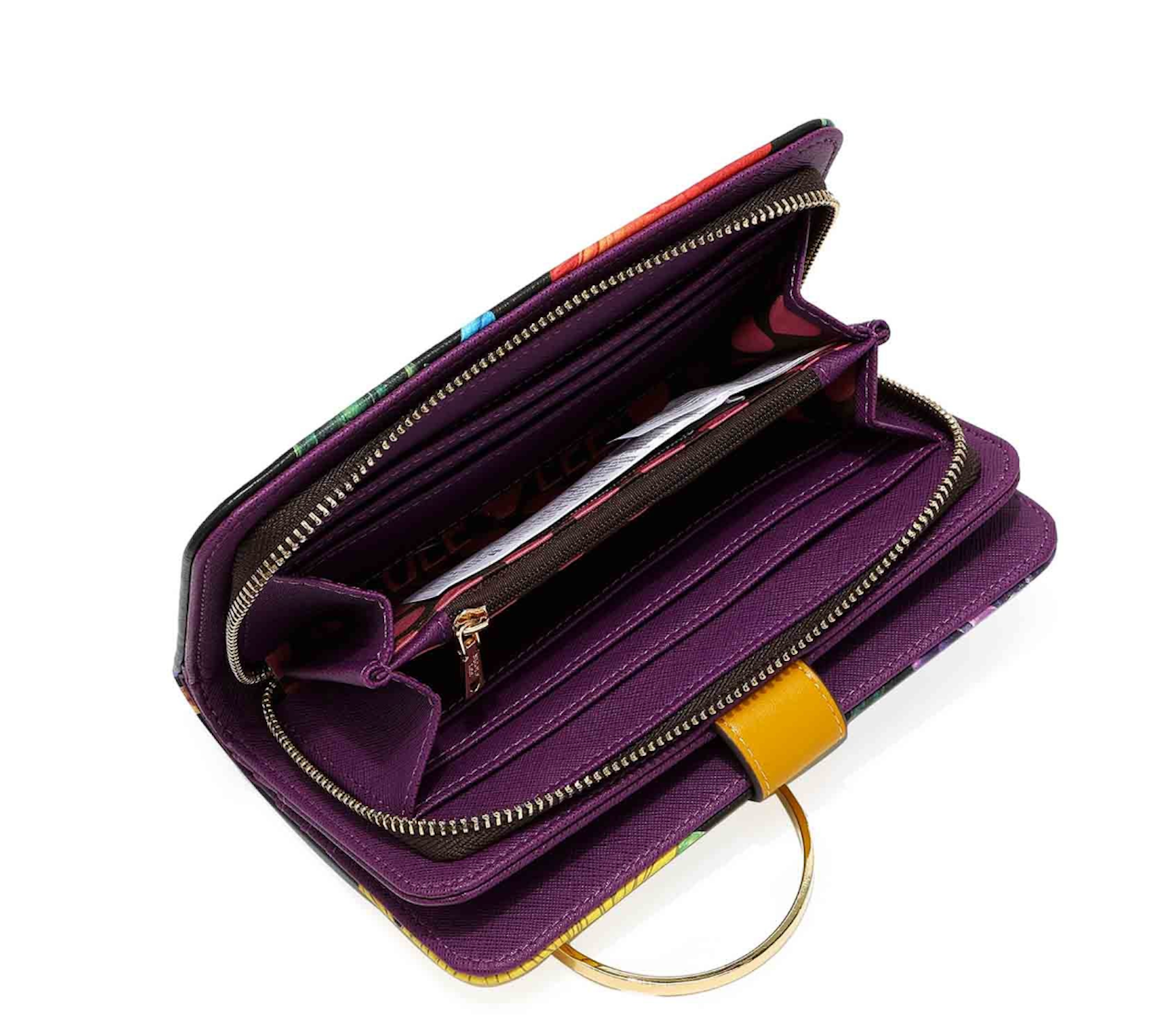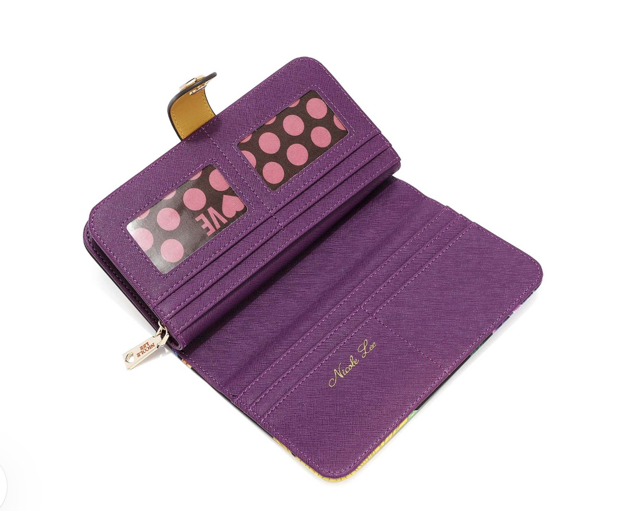 - Front zip compartment with 6 note slots and center zip coin compartment