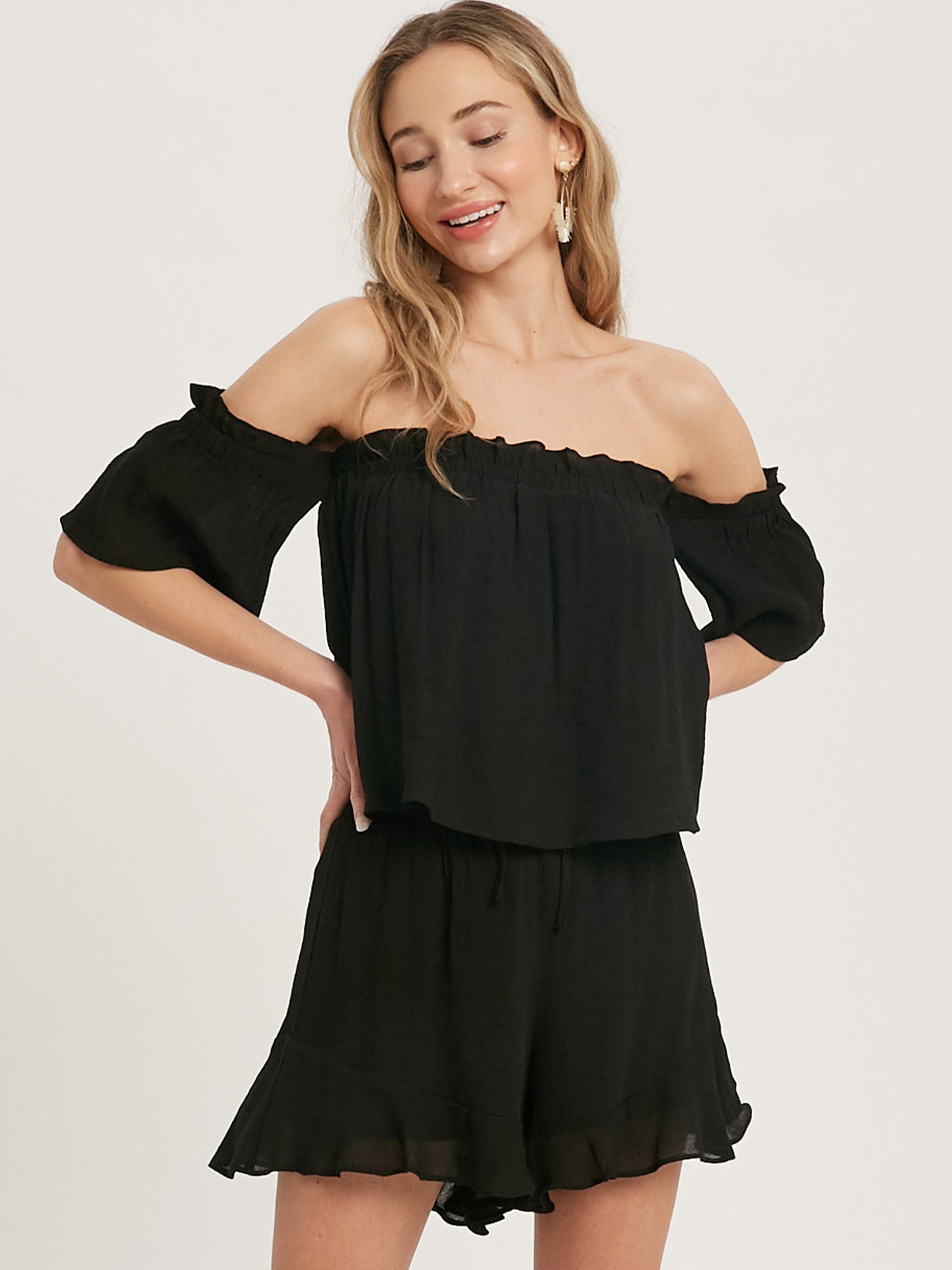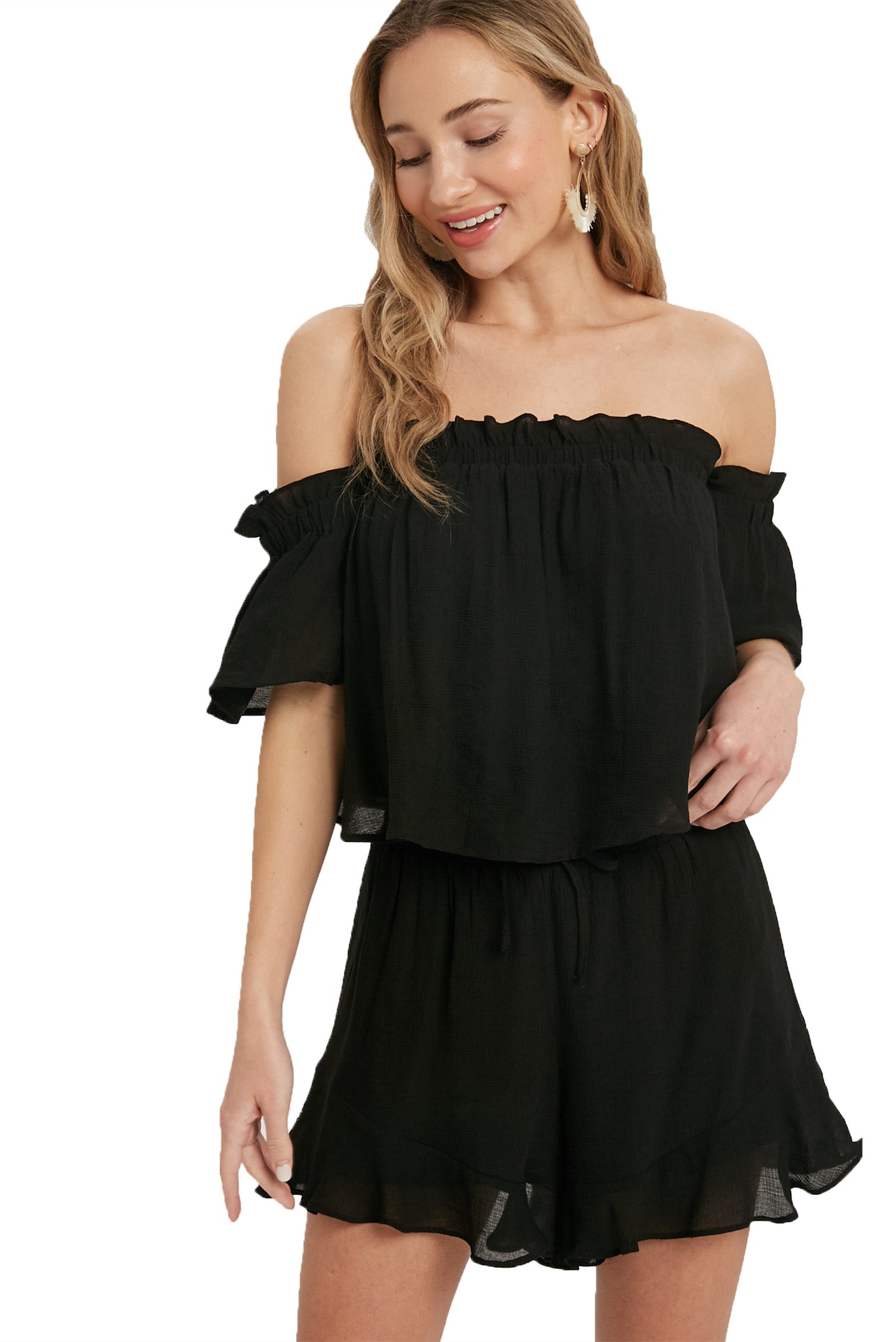 - Elastic neckline off the shoulder style crop top with elastic waist ruffle trim short shorts.