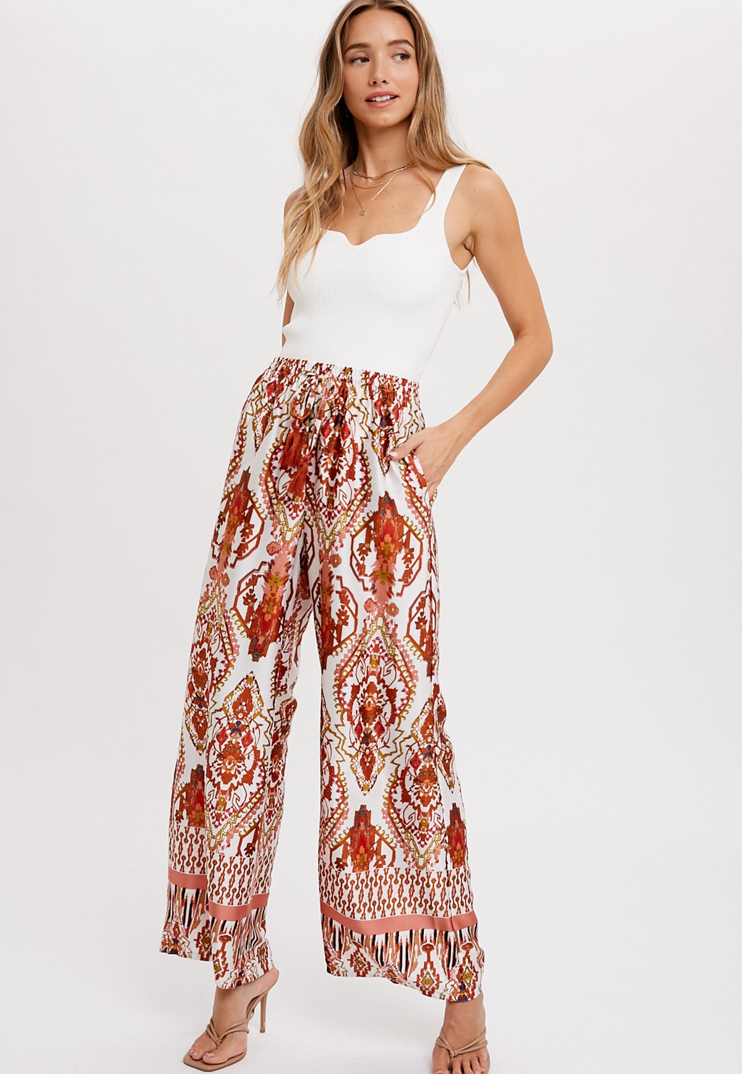 - Woven pants features an all over border boho print.