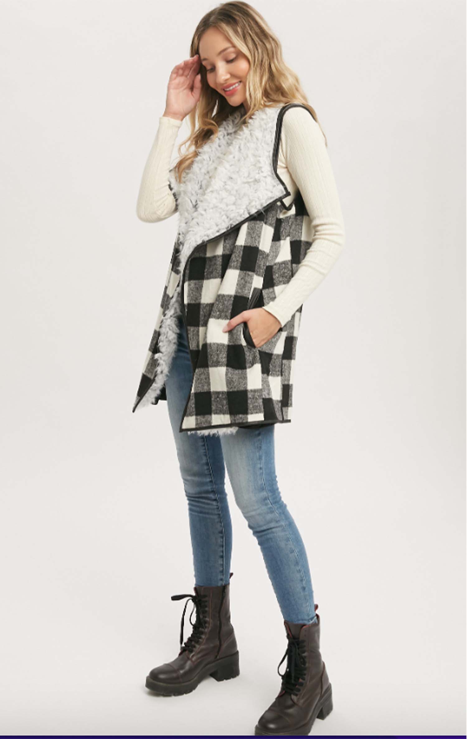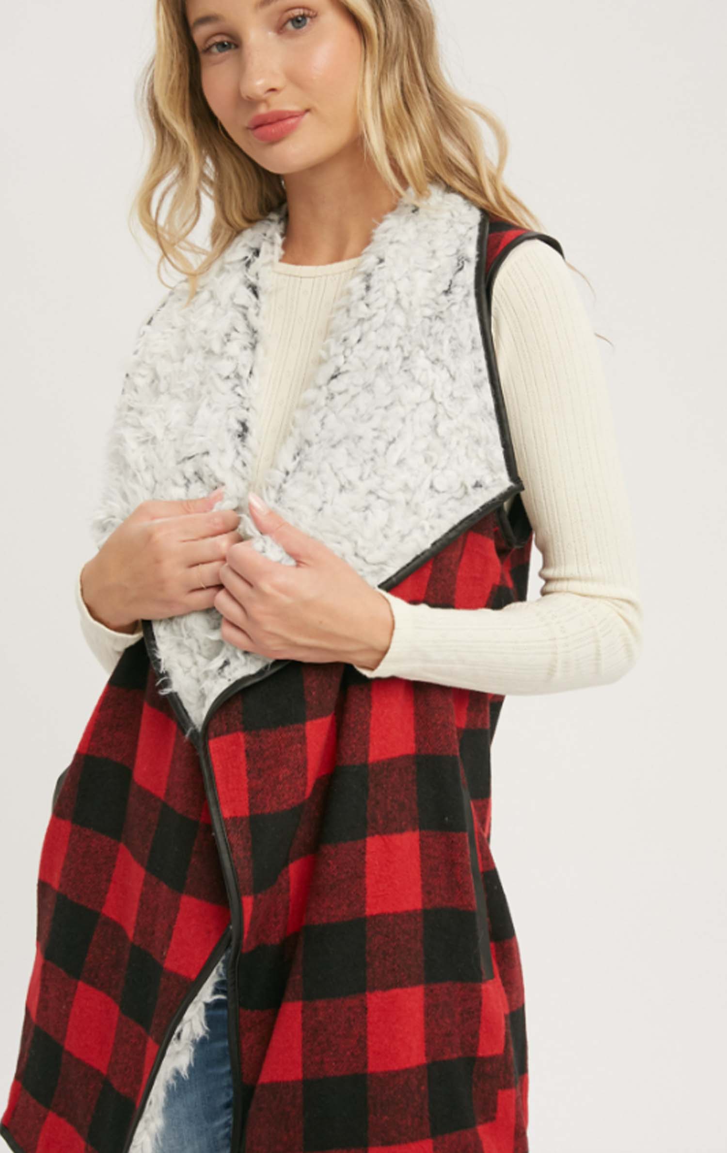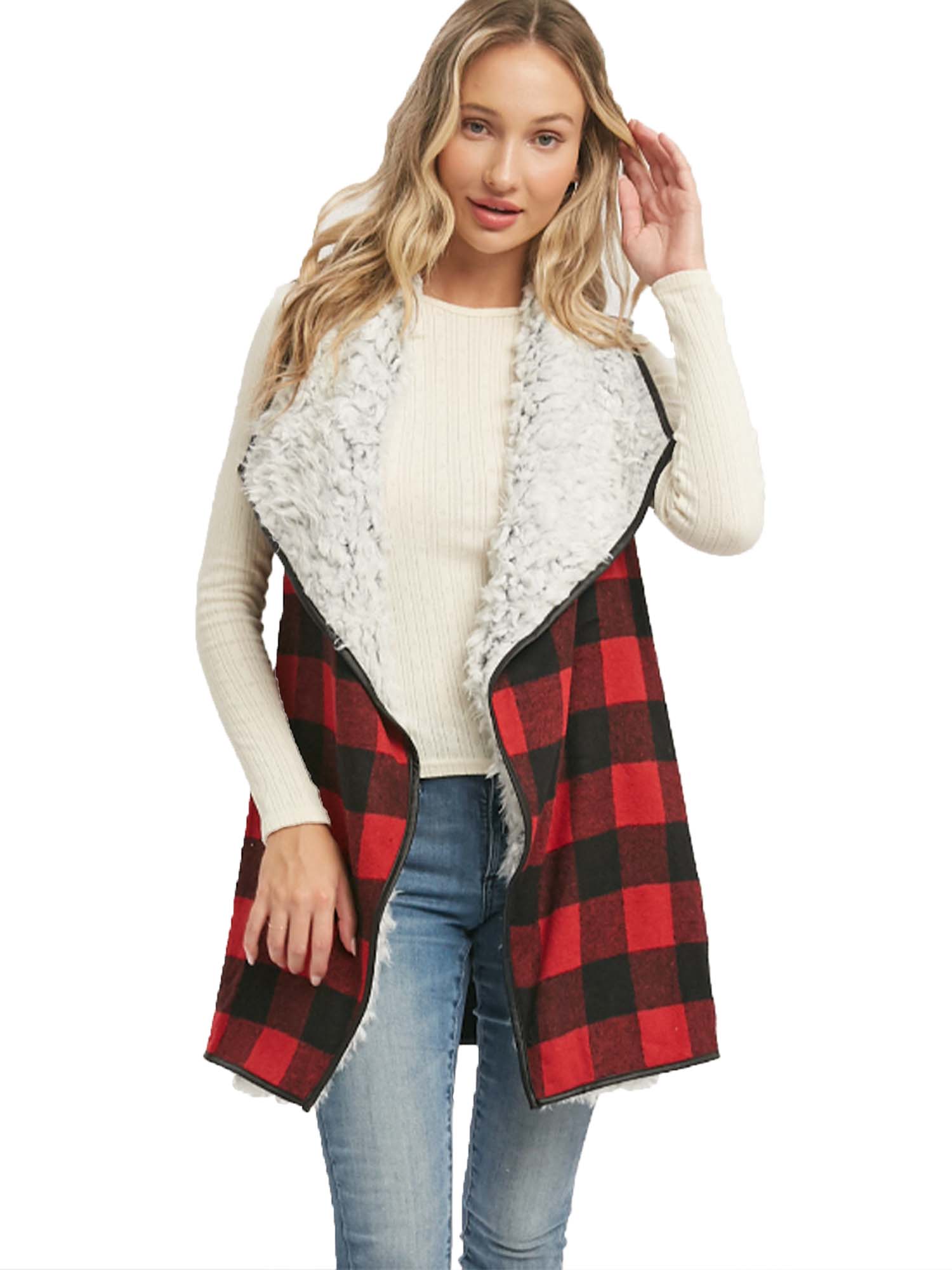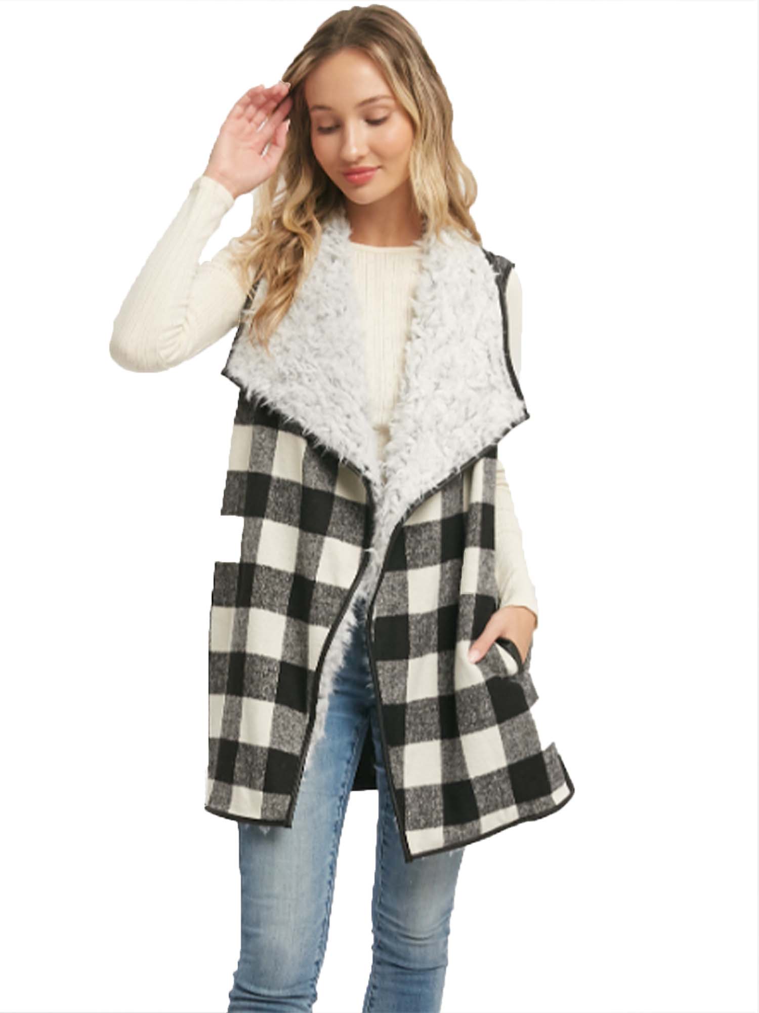 - Fuzzy buffalo plaid sherpa lined vest with a spread collar that covers the butt.