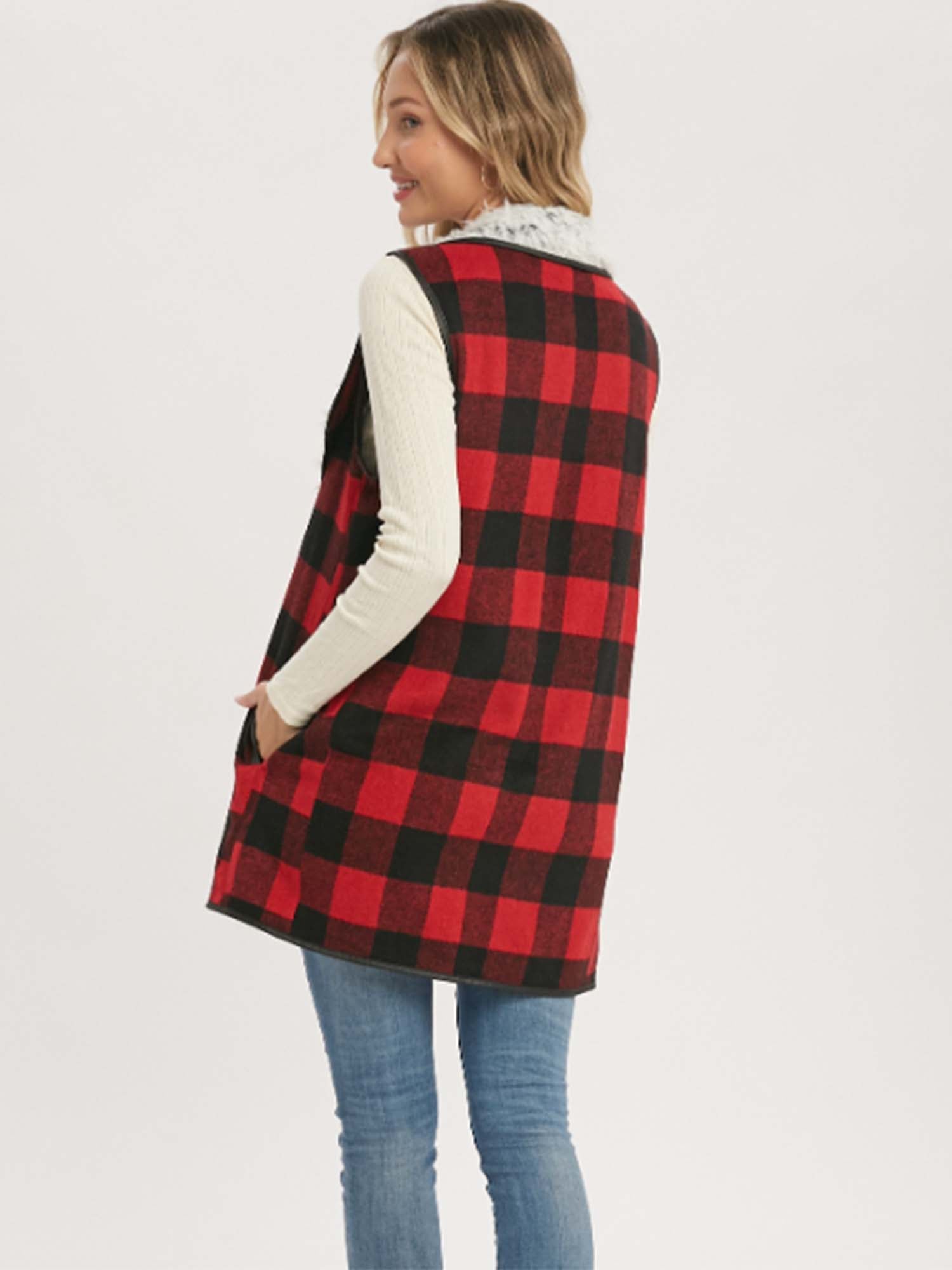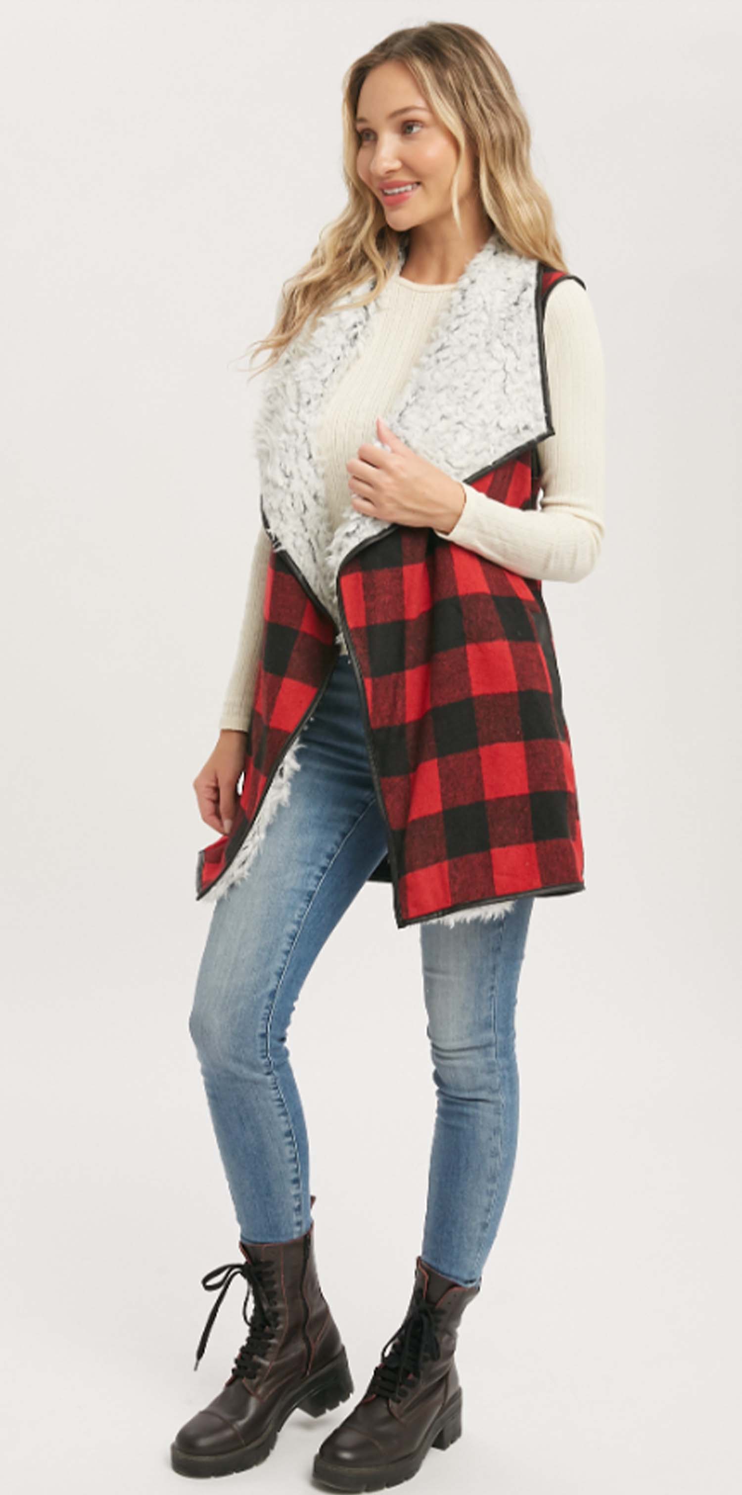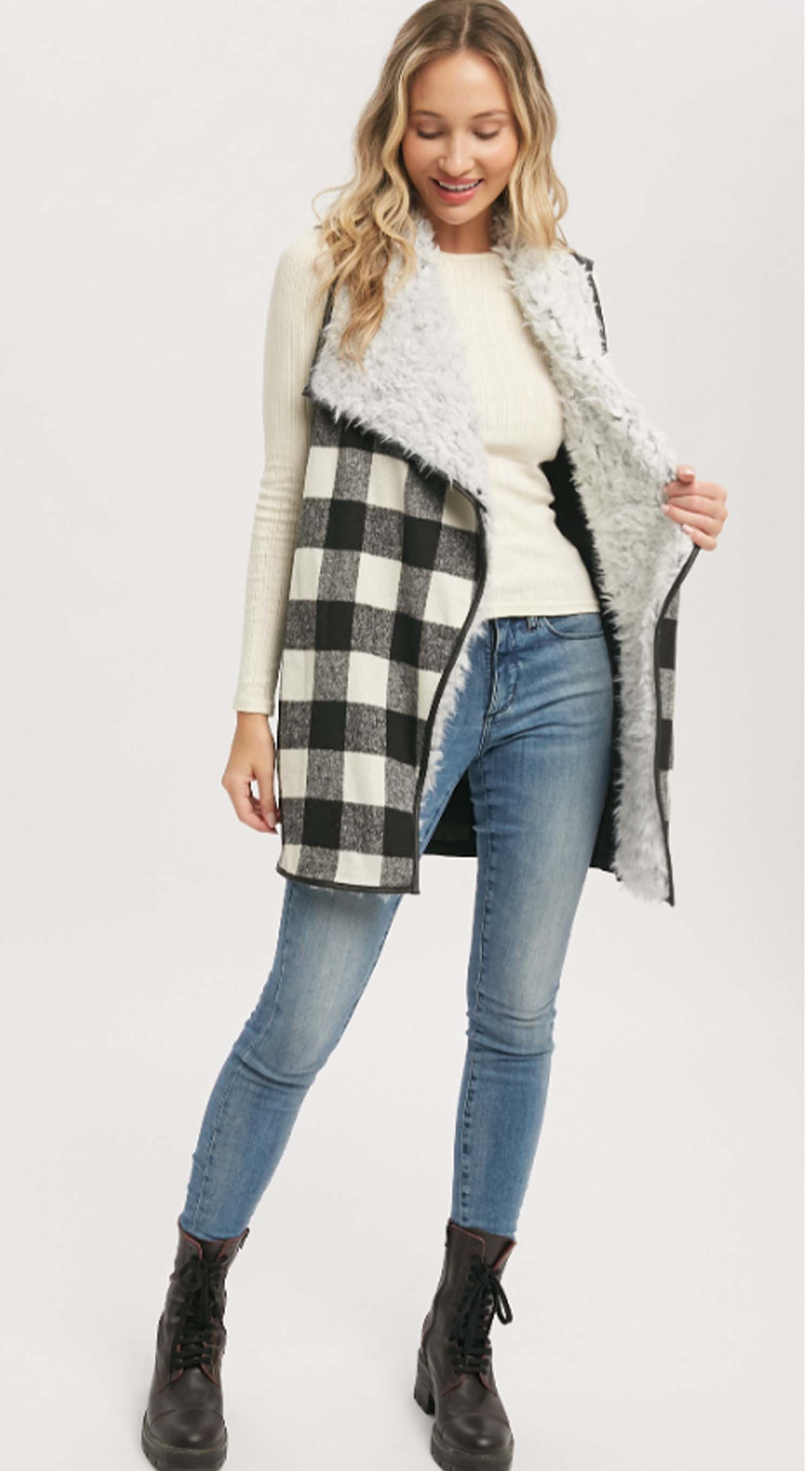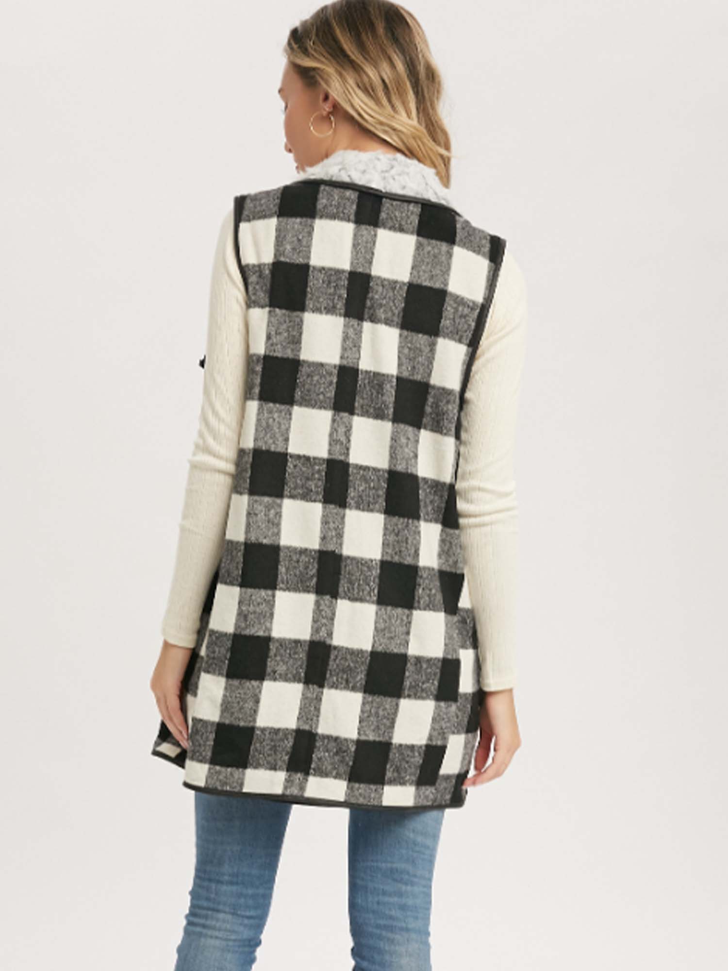 - Fuzzy buffalo plaid sherpa lined vest with a spread collar that covers the butt.