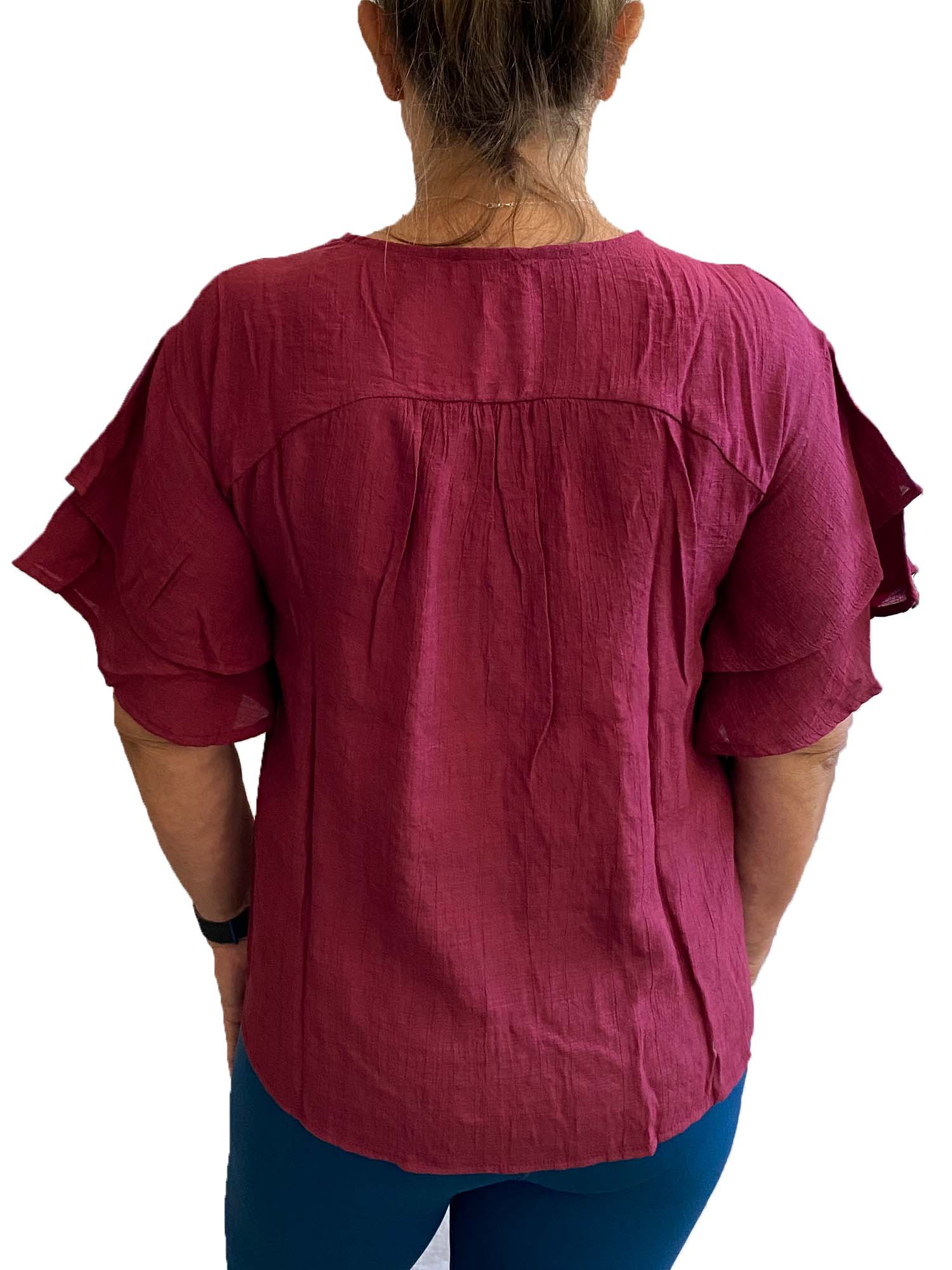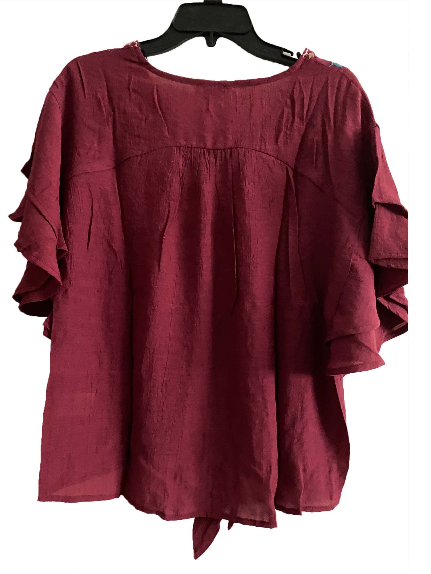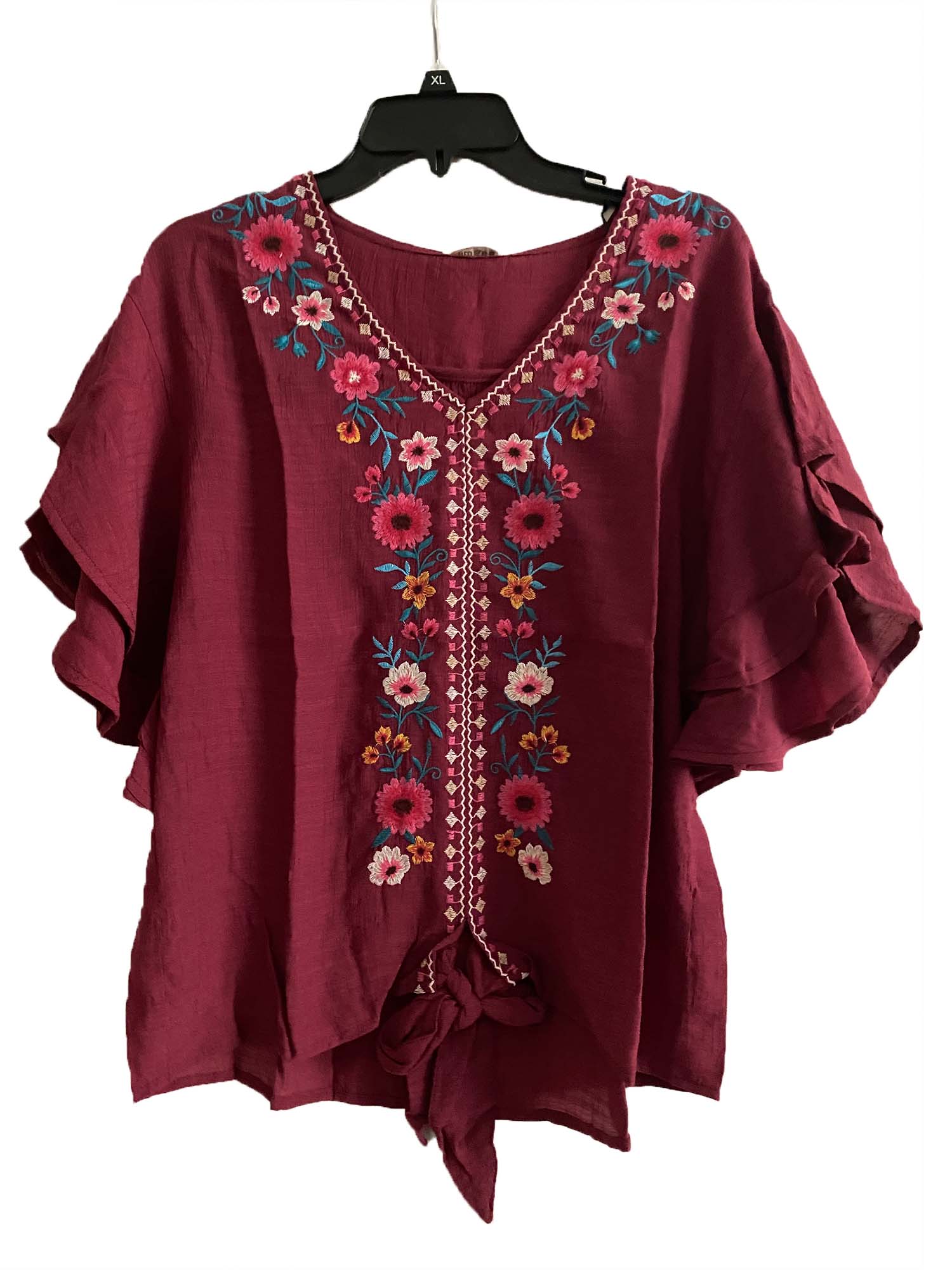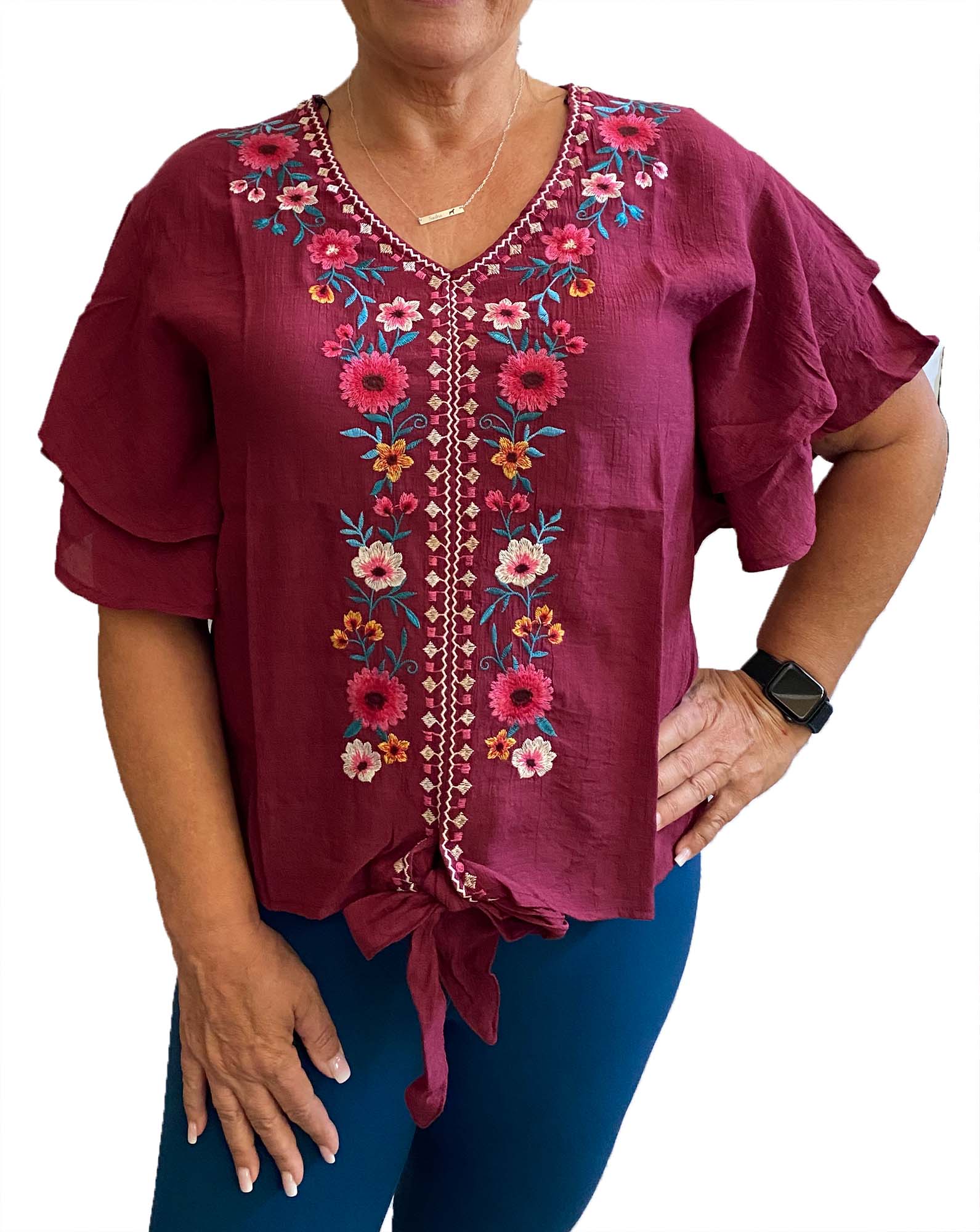 Floral Embroidered Ruffle Short Sleeve Top with a tie