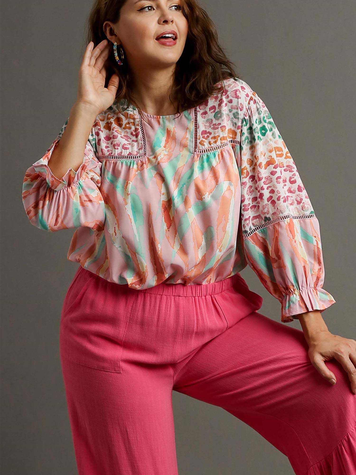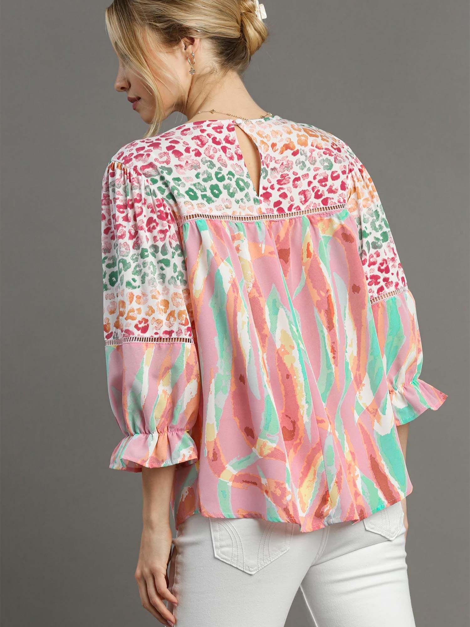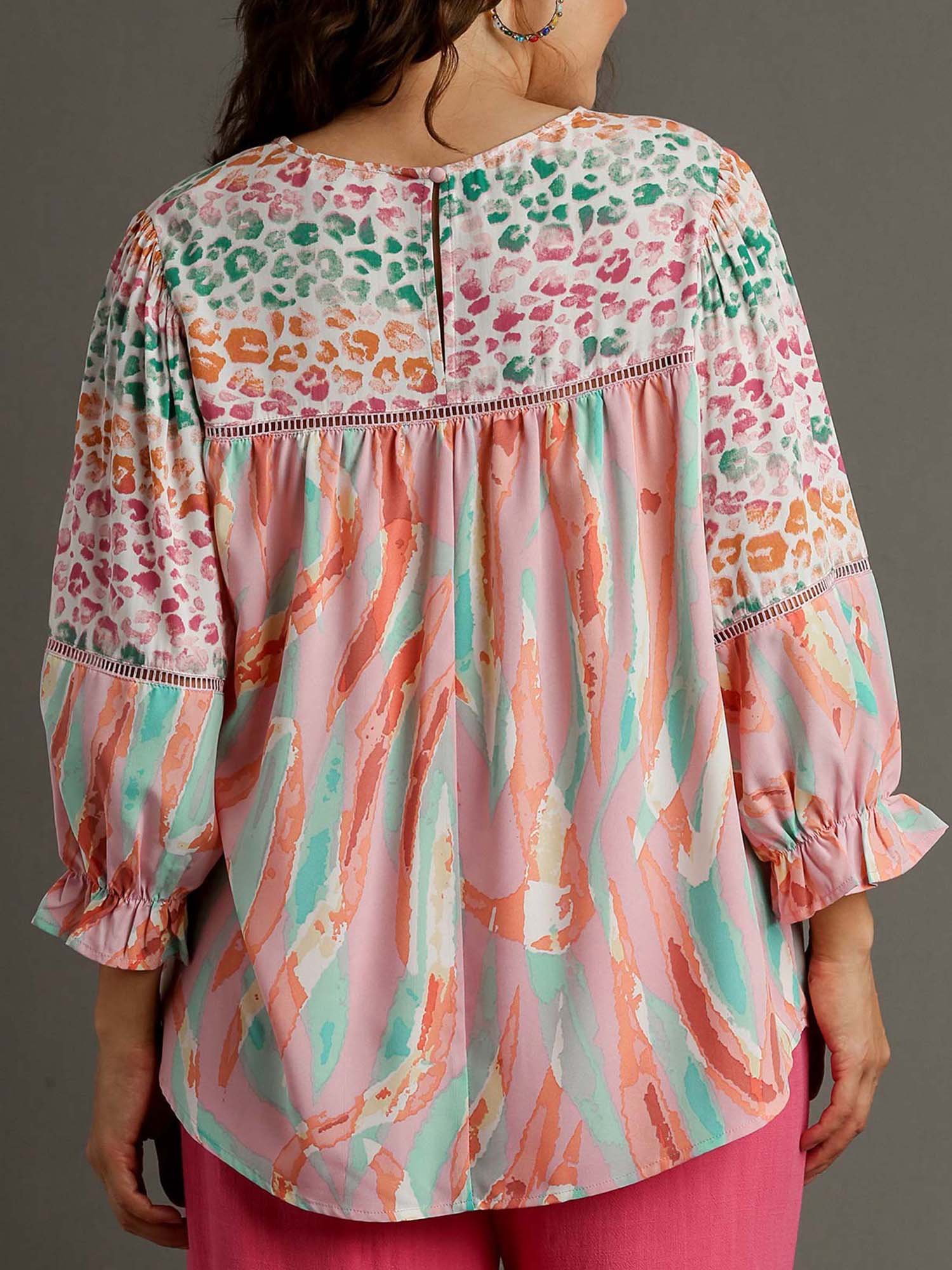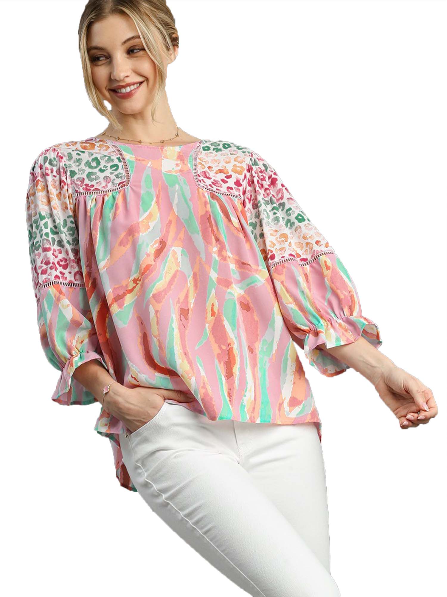 - Vibrant Pattern: This eye-catching top features a mixed print design with leopard spots and abstract brush strokes in shades of pink, orange, green, and white.