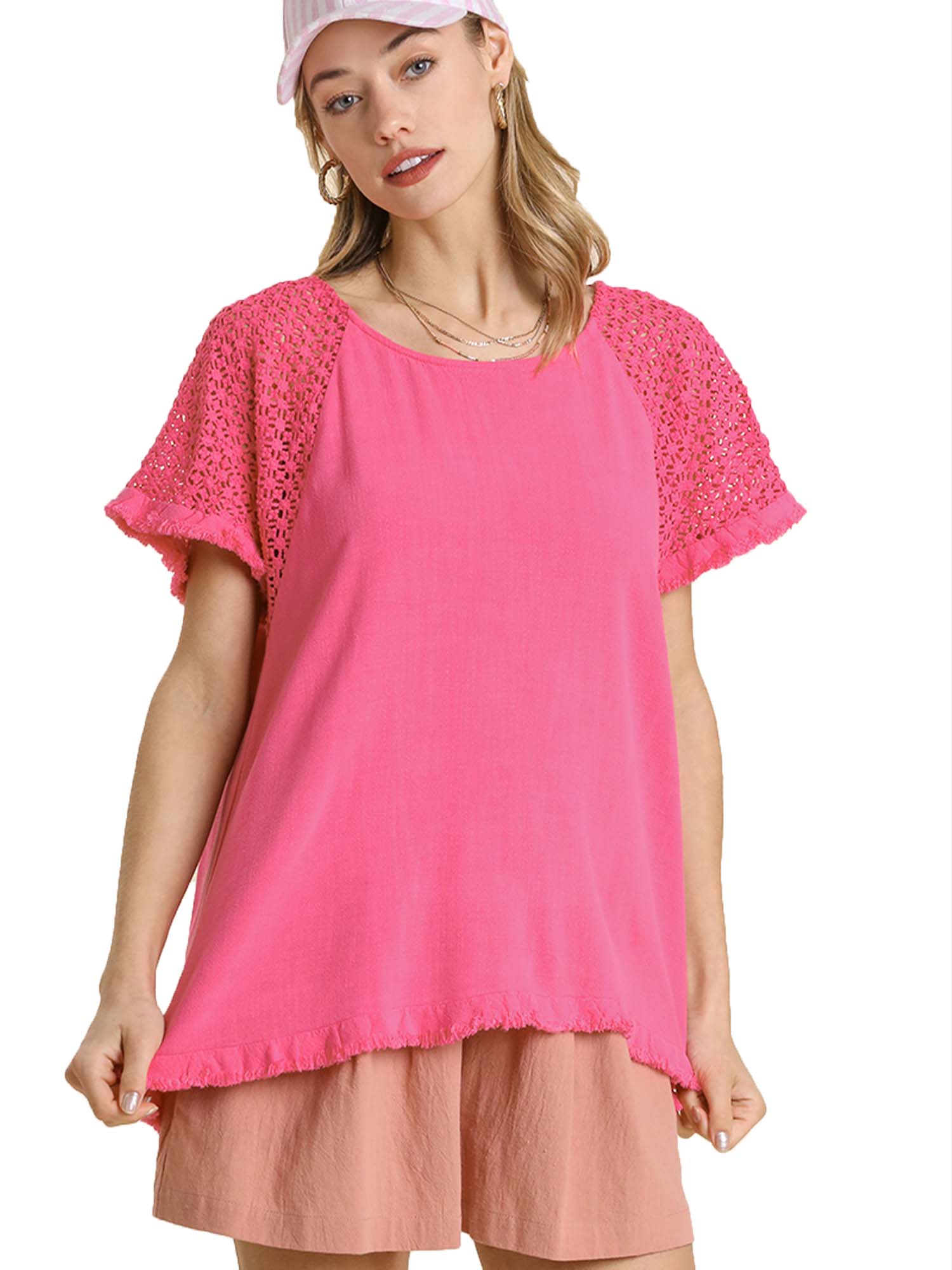 Linen Blend Crochet Detailed Short Sleeve Top with Fringed Hem