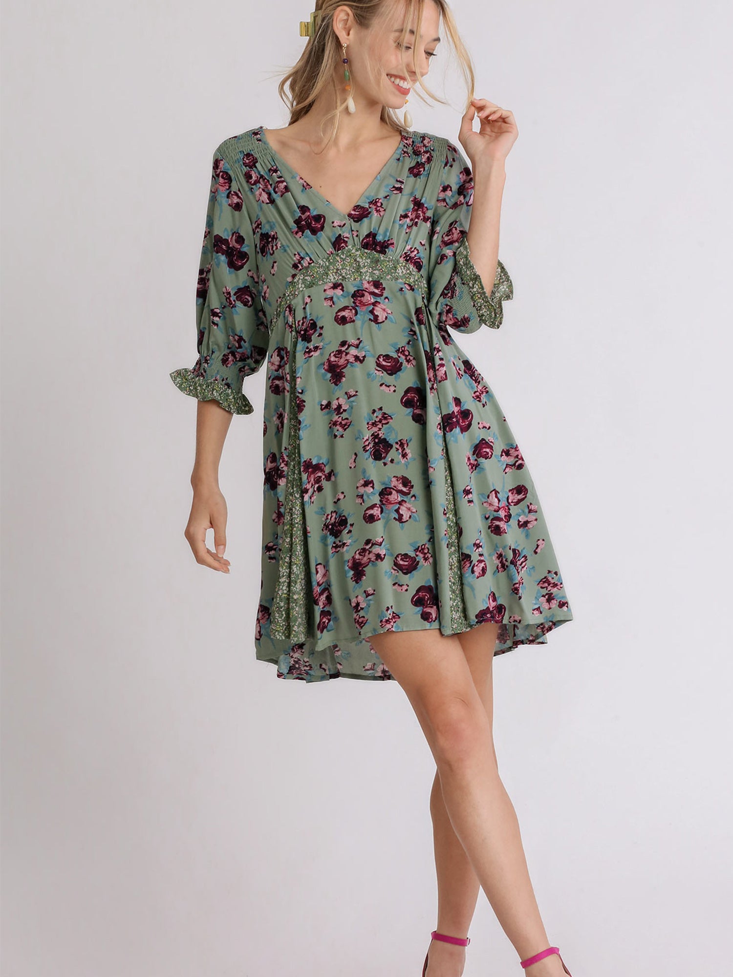 Mixed Floral Color Block Babydoll Dress with Pockets