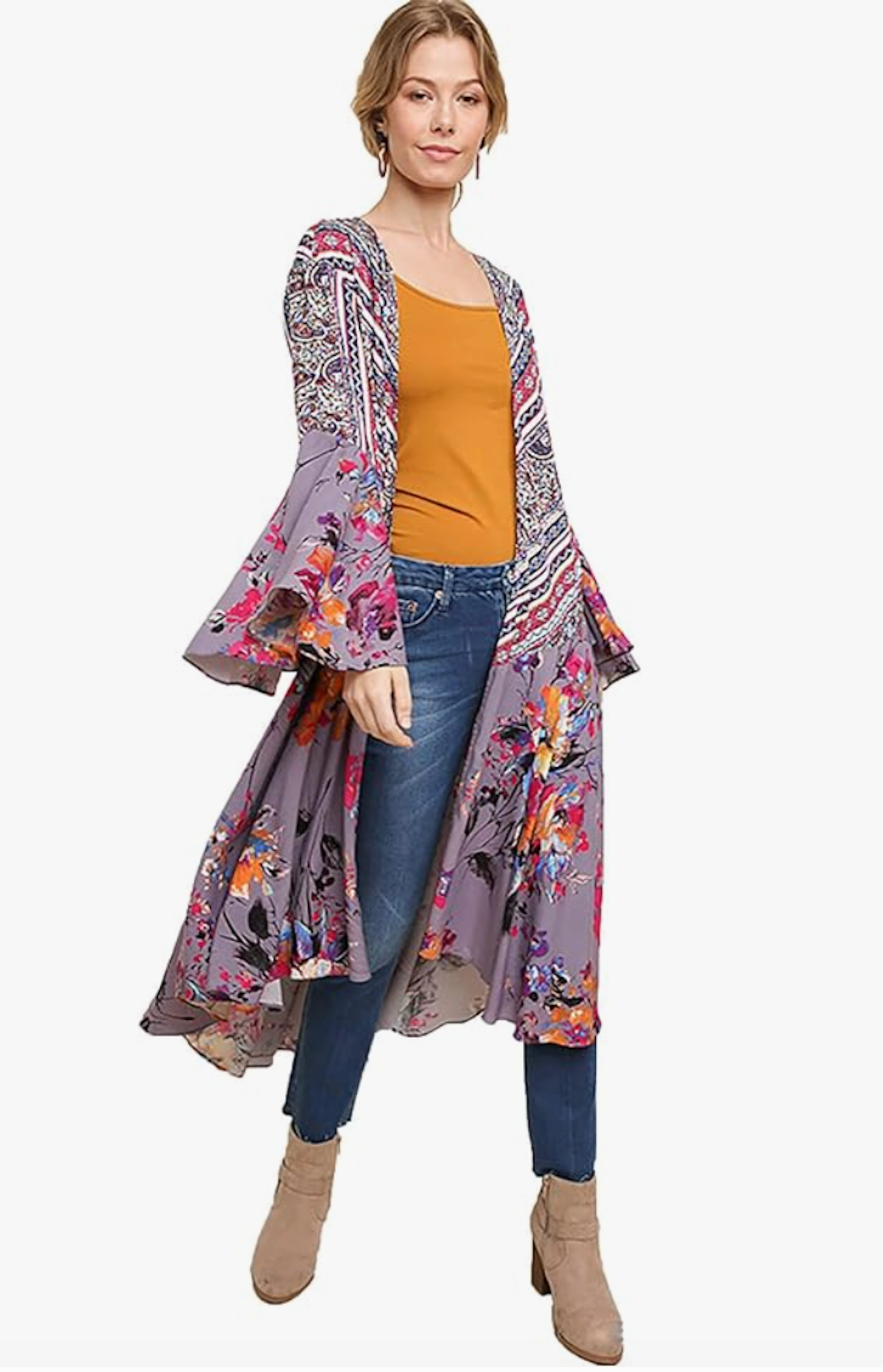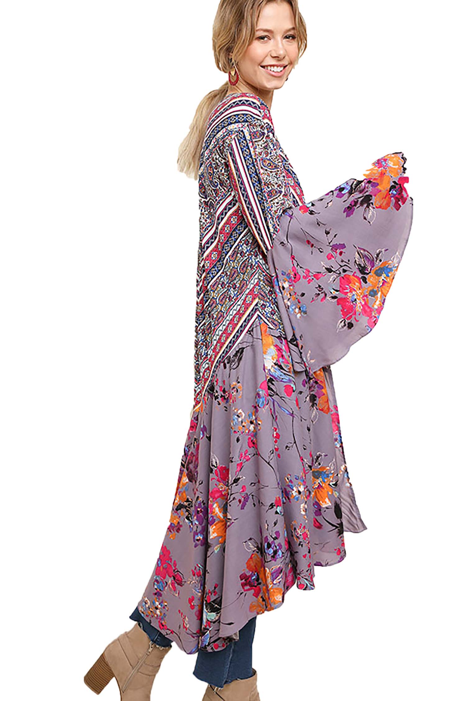 BohoChic Ruffled Long Body Grey Combo Kimono
