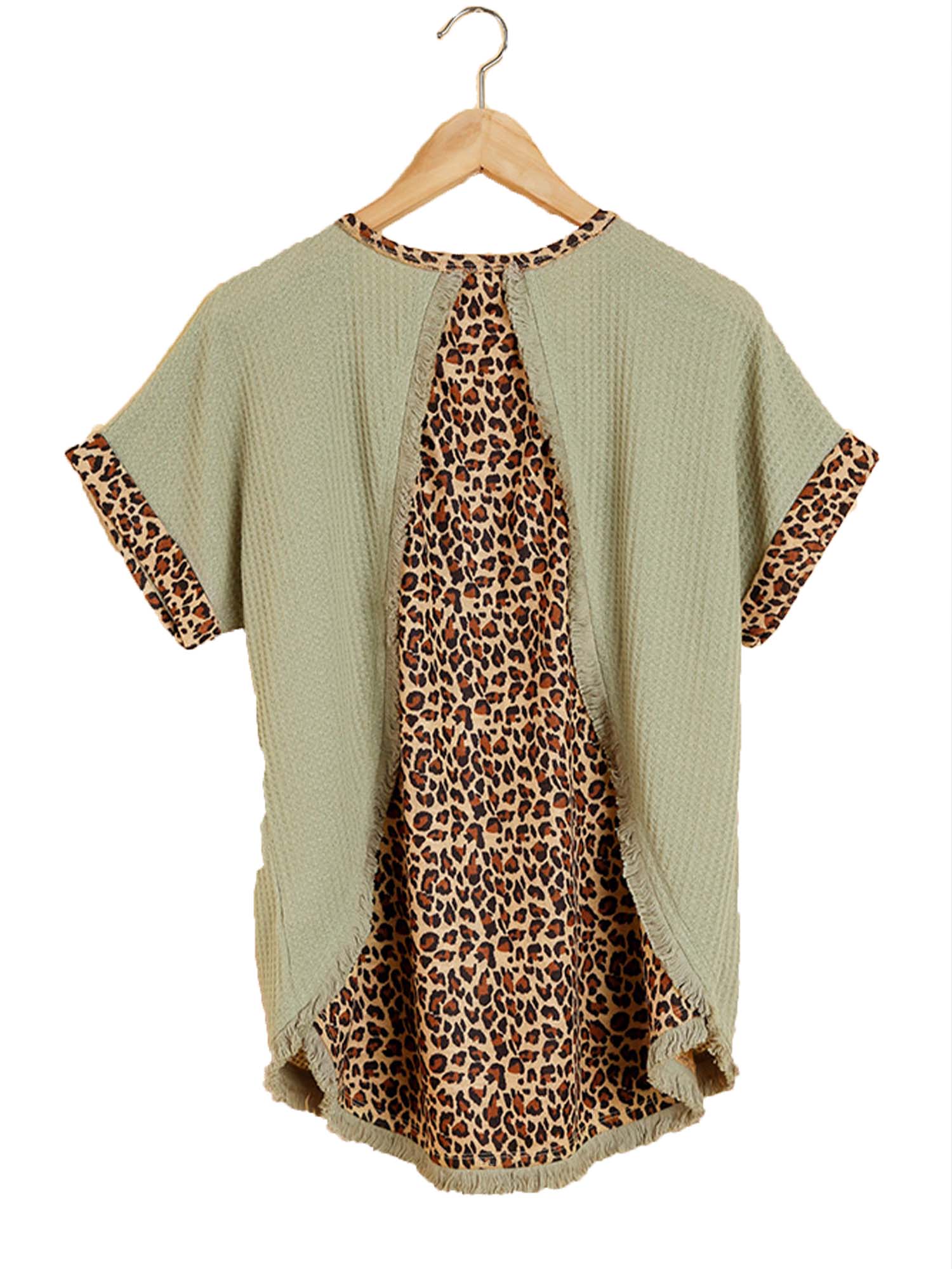 Waffle Knit cap sleeve top with Leopard and Frayed Hem