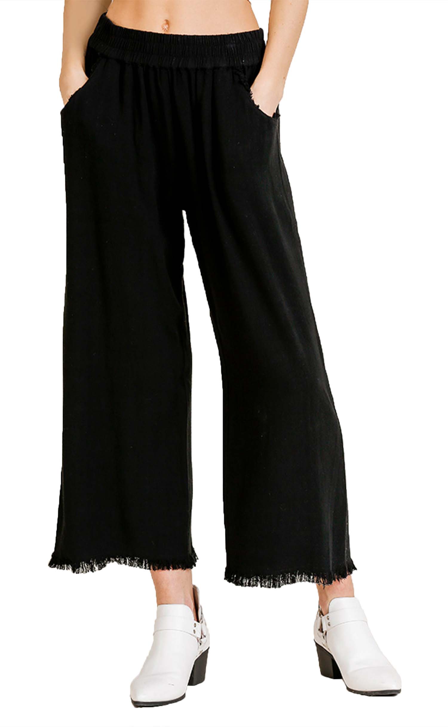 Wide Leg Pant with Elastic Waist, Pockets, and Frayed Hem